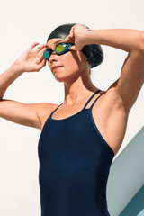 The Murray is a non-adjustable swim onesie with four criss-cross back straps and a slim band around the ribcage. This suit features a filled-in side panel for a secure and flattering silhouette