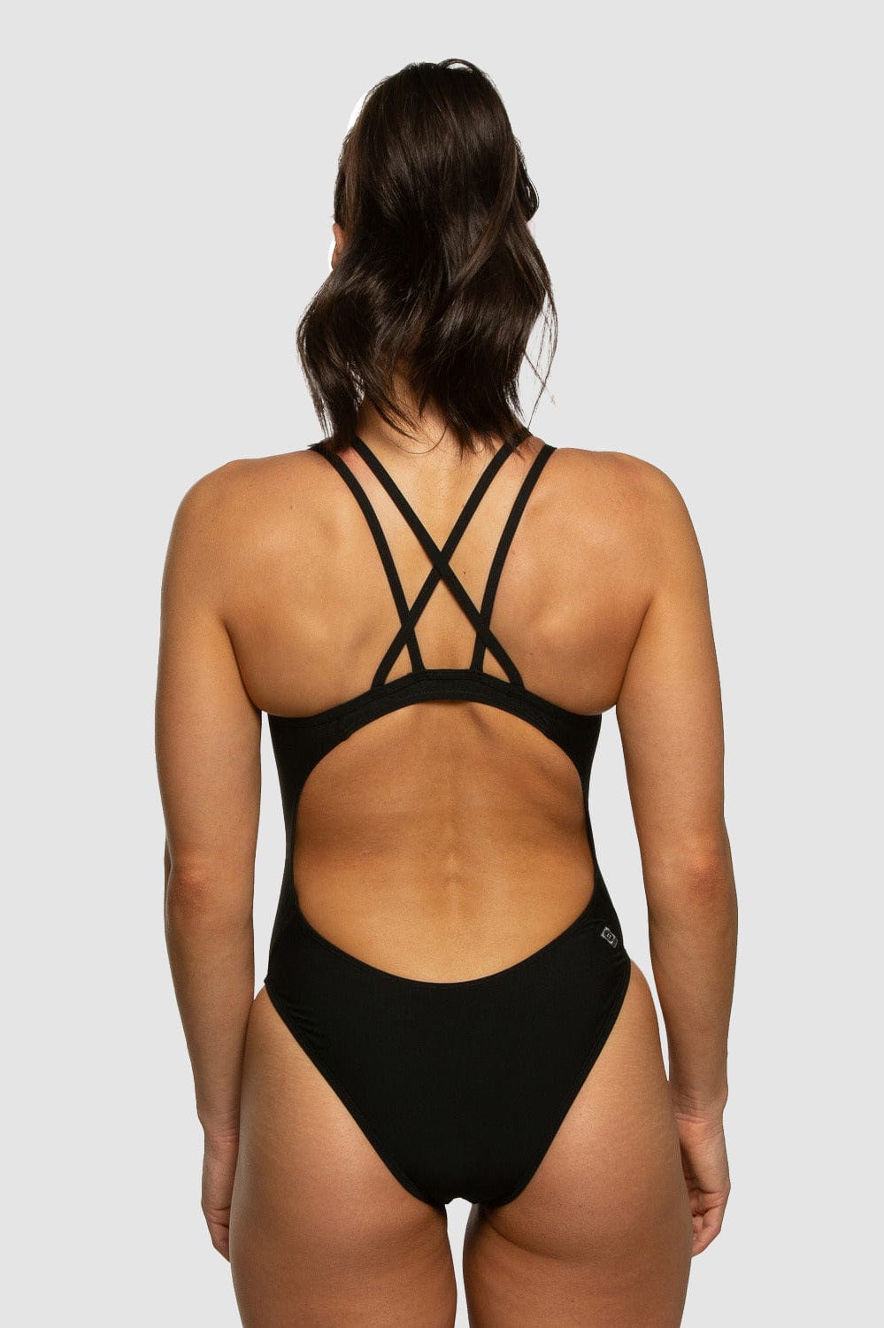The Murray is a non-adjustable swim onesie with four criss-cross back straps and a slim band around the ribcage. This suit features a filled-in side panel for a secure and flattering silhouette